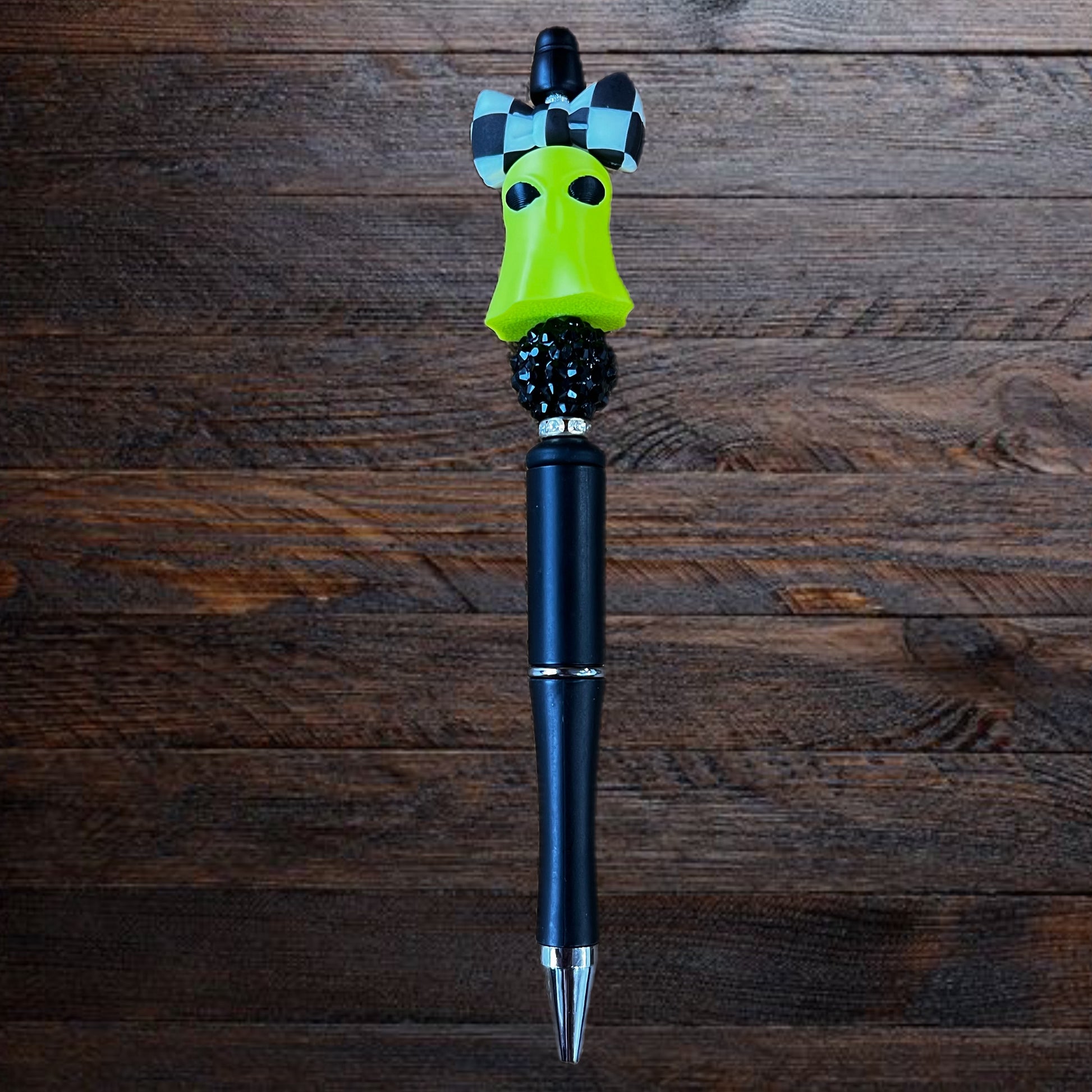 This out-of-this-world cutie is rocking a neon green alien charm topped with a bold black-and-white checkered bow. Finished with a sparkling black bead and a sleek matte black barrel, it’s the perfect mix of extraterrestrial sass and goth glam.