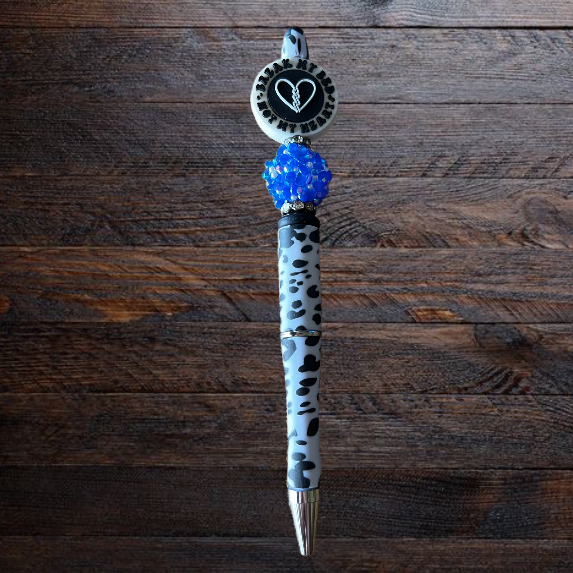 Bold and striking—this black-and-white cow print pen with a broken heart focal and deep blue sparkle bead adds attitude to your everyday writing.