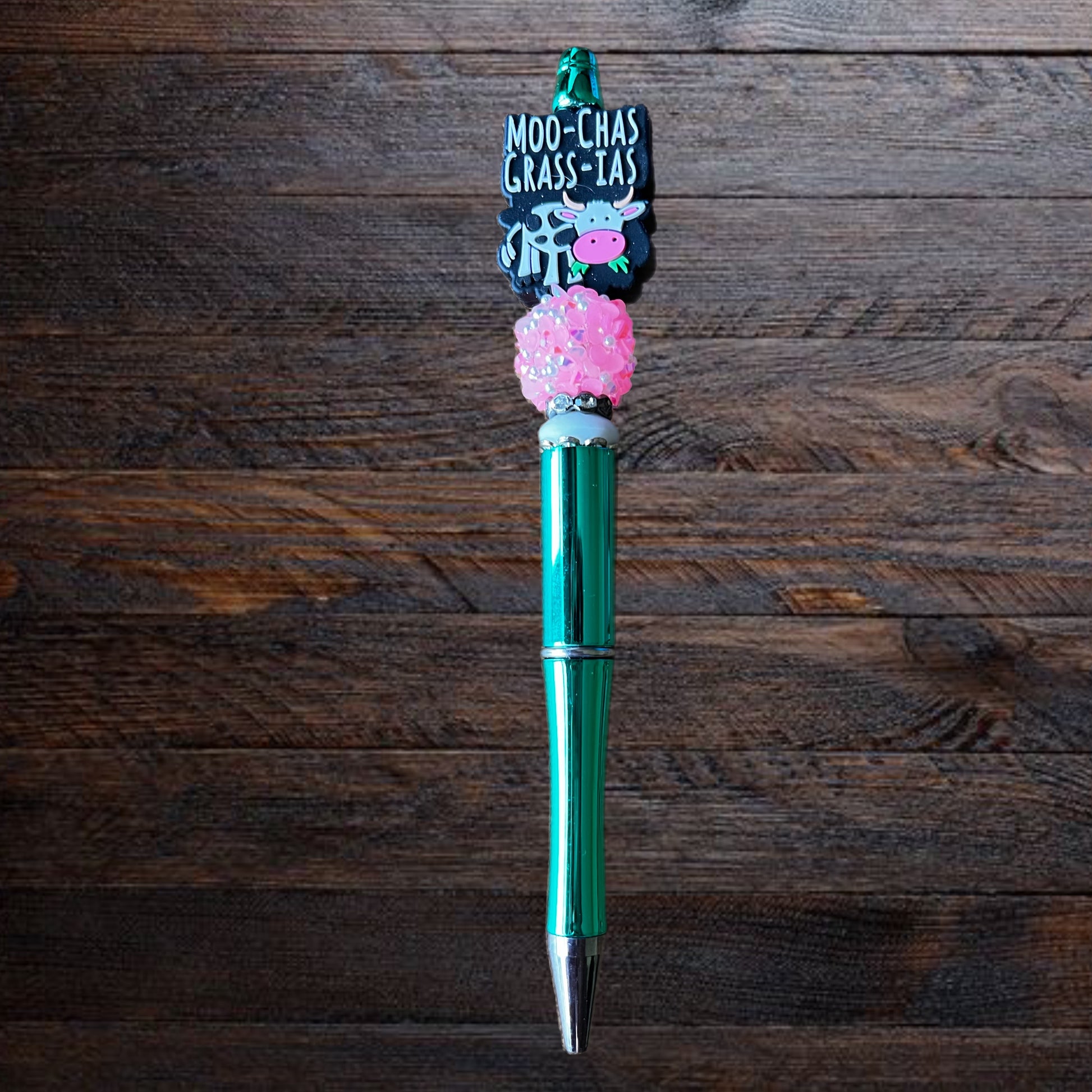 Say thank you in style with this fun cow-themed design! The “Moo-chas Gracias” charm with its sparkling pink accent bead brings a playful touch to your writing.
