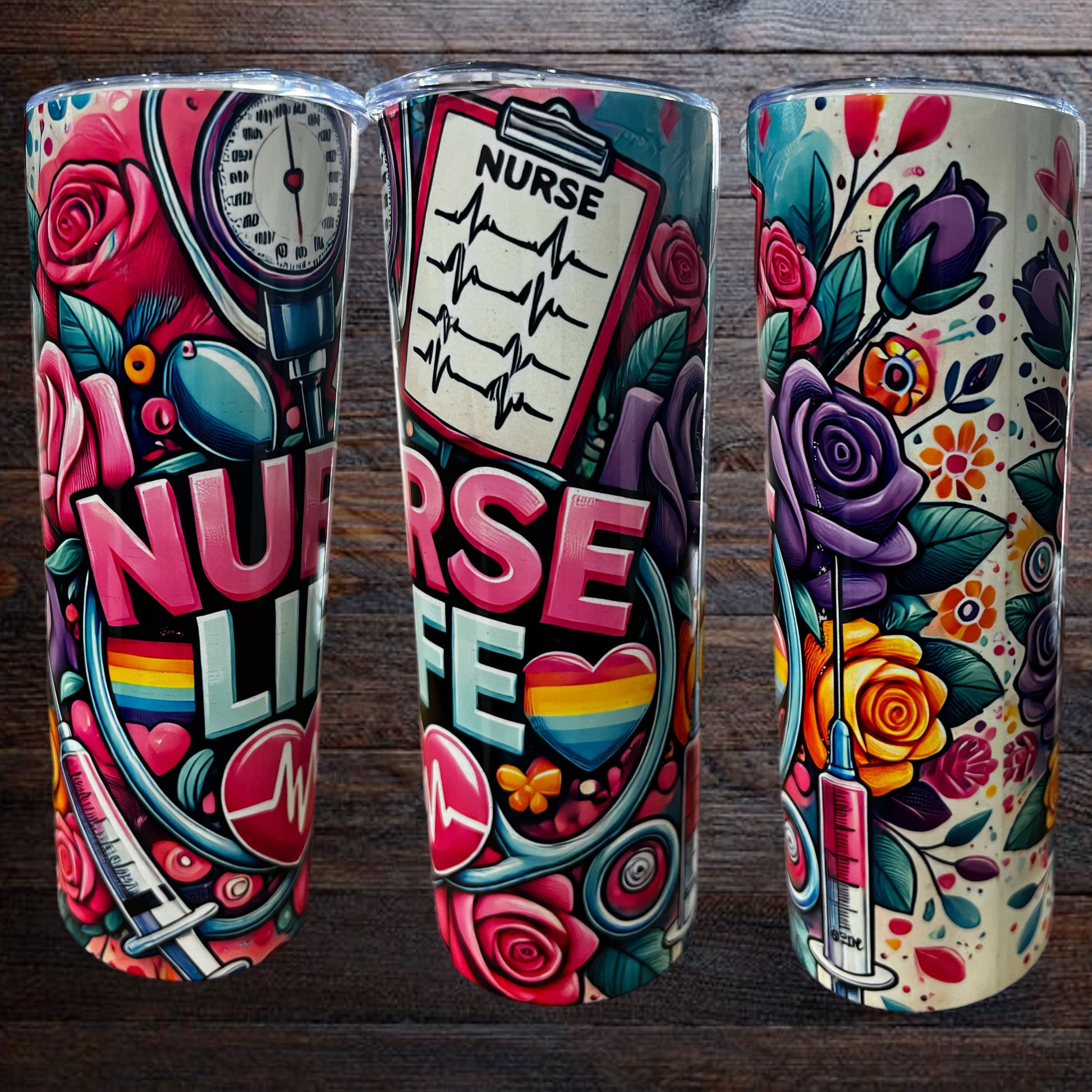 Bright, bold, and full of heart—this Nurse Life tumbler celebrates the everyday heroes who keep us going. Bursting with colorful flowers, stethoscopes, syringes, and heartbeats, it’s a stylish way to stay fueled through long shifts and big hearts.