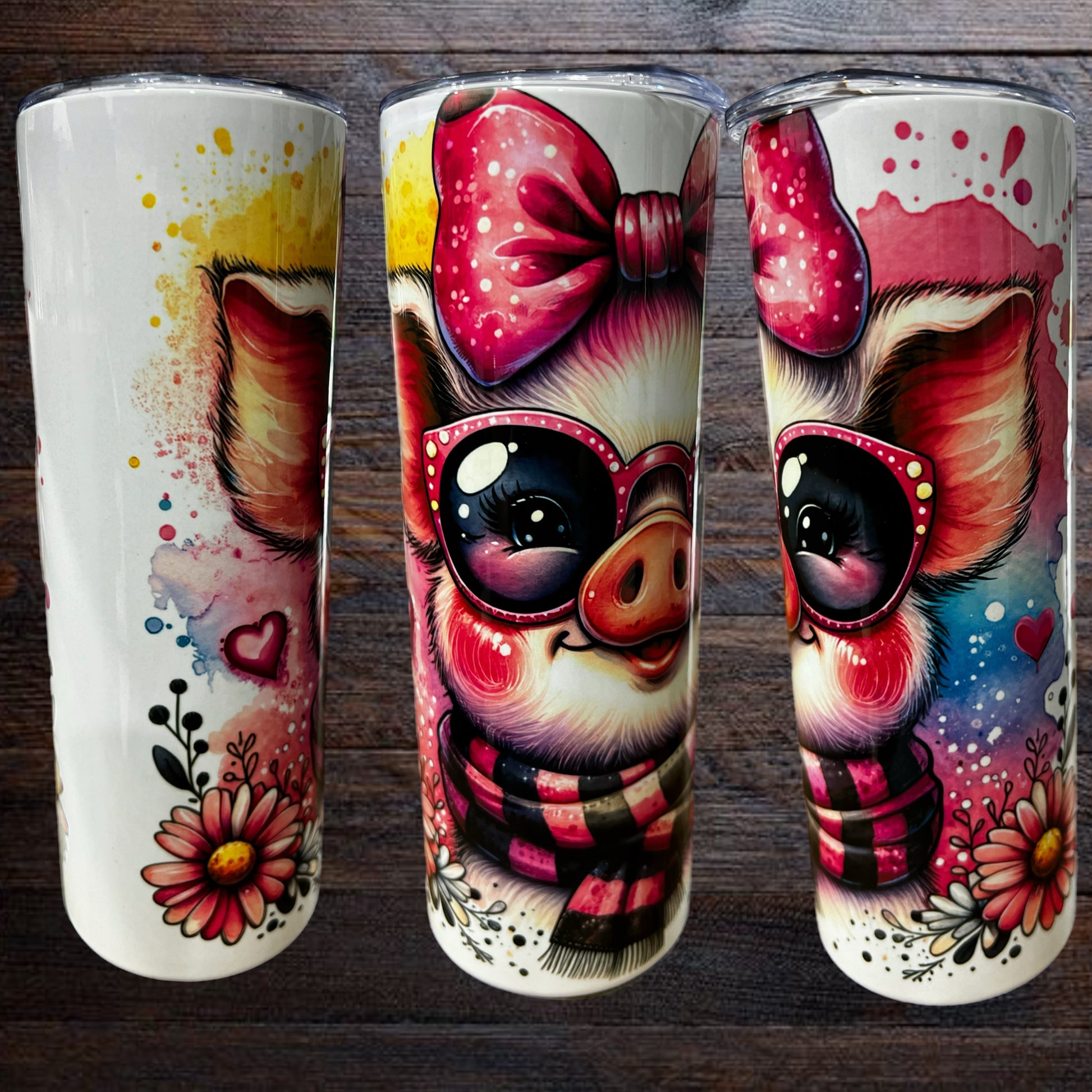 Cute, colorful, and full of personality—this Pretty in Pig tumbler features an adorable pig in sparkly heart-shaped sunglasses, a big pink bow, and a cozy striped scarf. Surrounded by cheerful flowers and watercolor splashes, this tumbler is perfect for anyone who loves a little glam with their farm vibes.