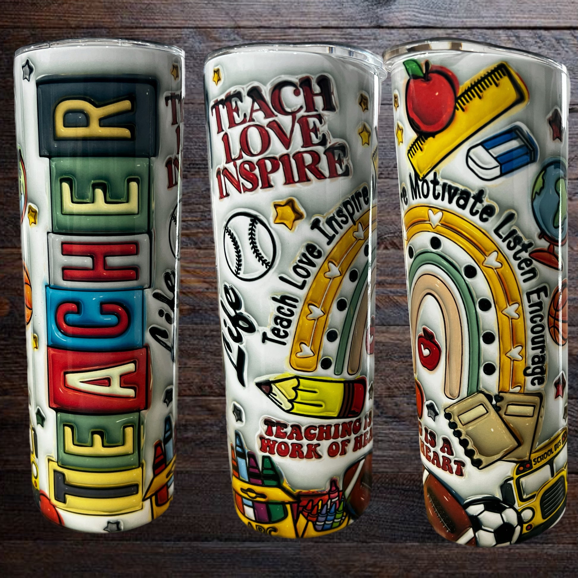 This bright and cheerful Teach Love Inspire tumbler is a celebration of everything teachers do—motivate, encourage, listen, and lead with love. Covered in playful school-themed icons, vibrant rainbows, and inspiring phrases, it’s the perfect daily companion for any dedicated educator.